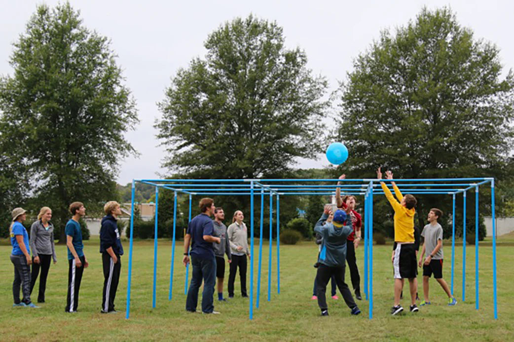 A mix of volleyball and four square, but raised off the ground. Nine connected squares form a grid, and players rotate through positions while volleying a ball overhead. It’s fast-paced, competitive, and a huge hit at camps and youth events.